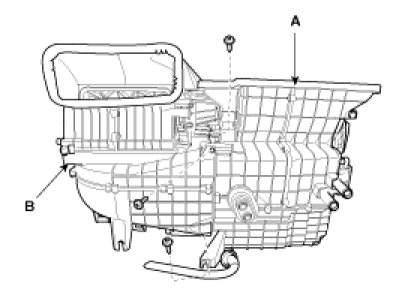 5. Remove the blower unit (A) from the heater unit after loosening a mounting bolt and 3 screws.
