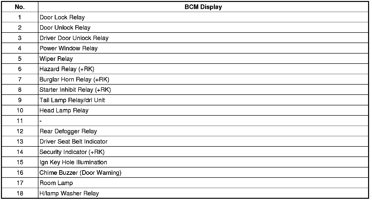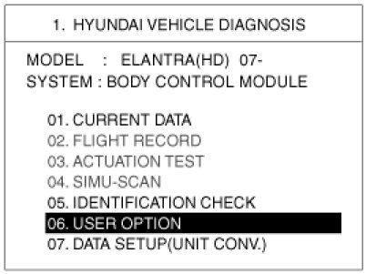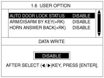 The BCM offers 4 items user option mode for a user convenience (AUTO DOOR LOCK, ARM/DISARM BY KEY, HORN ANSWER BACK)