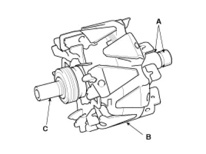 2. Check that there is no continuity between the slip rings and the rotor(B) or rotor shaft(C).