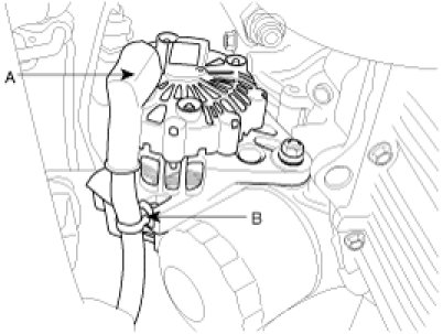 2. Disconnect the alternator connector(A) and "B" terminal cable from the alternator. Loosen the chip(B).