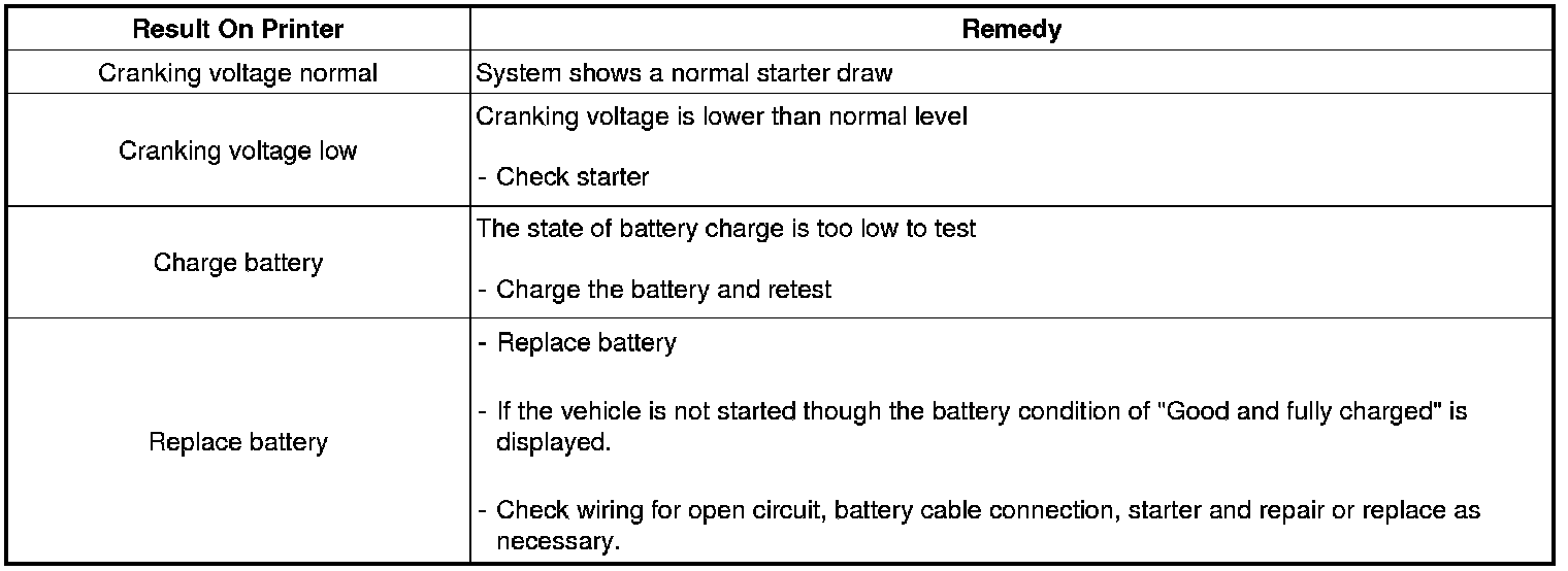 A relevant action must be given according to the test results by referring to the battery test results as shown in the table below.
