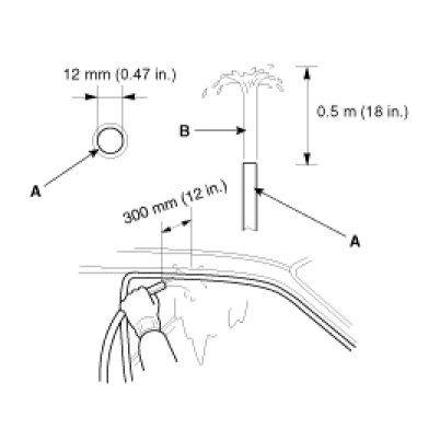 D. Hold the hose about 300mm(12in.) away from the door (C).