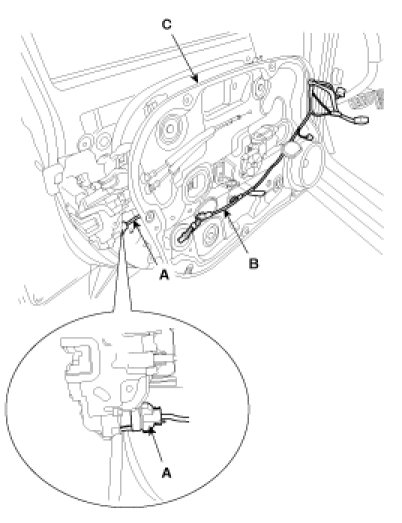 5. Disconnect the door module wiring harness (B), then remove the module assembly (C).