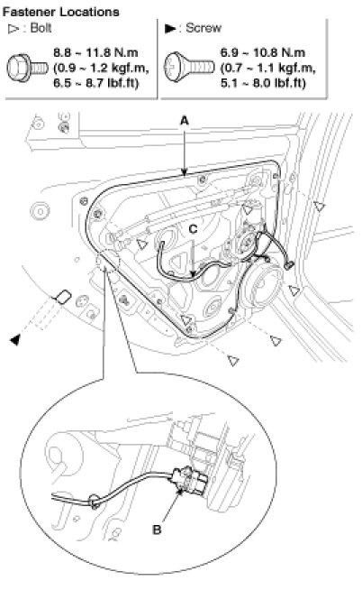 3. After loosening the door module mounting bolts, remove the door module (A).