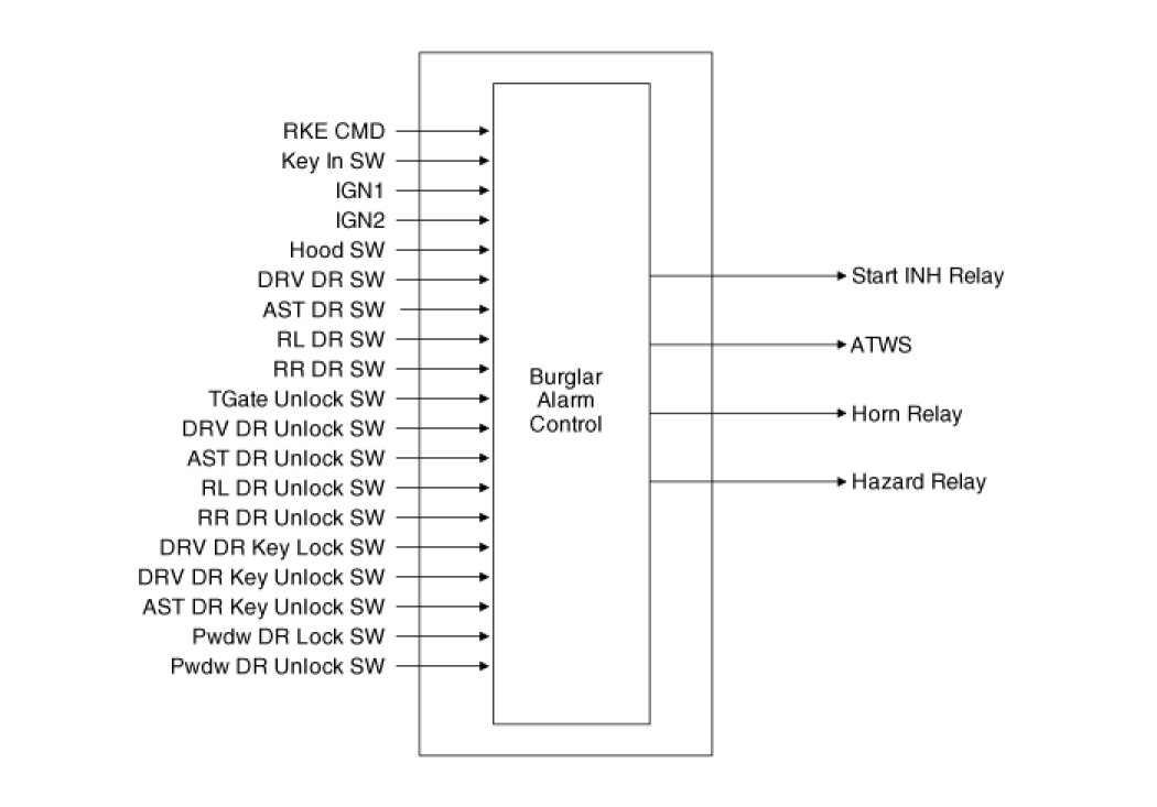 For the system to arm, the ignition switch must be off and the key removed. Then, the body control module must receive signals that the doors, hood, and tailgate are closed and locked. When everything is closed and locked, none of the control unit inputs are grounded.