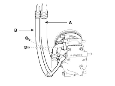 5. Remove the bolts, then disconnect the suction line (A) and discharge line (B) from the compressor. Plug or cap the lines immediately after disconnecting them to avoid moisture and dust contamination.