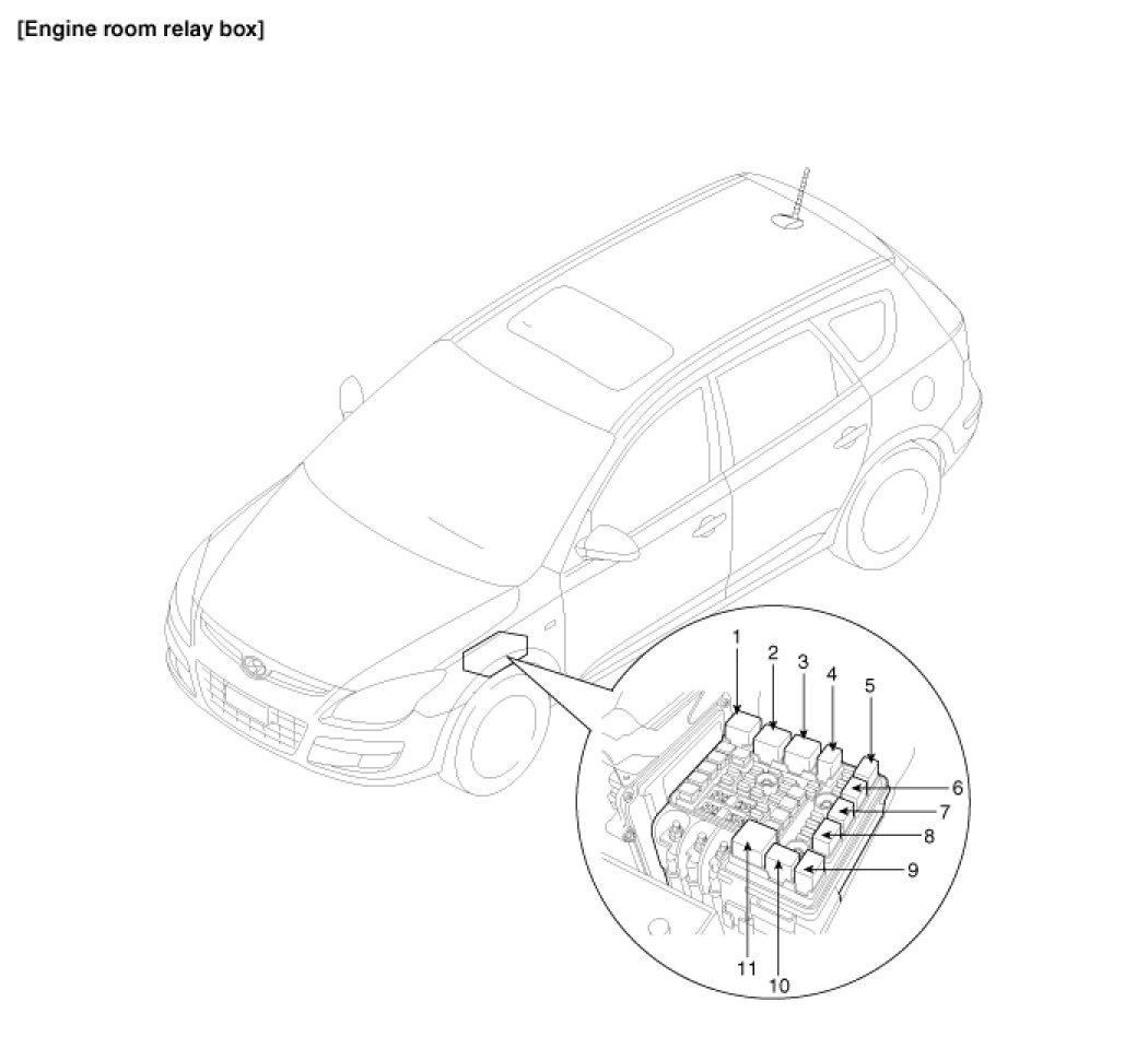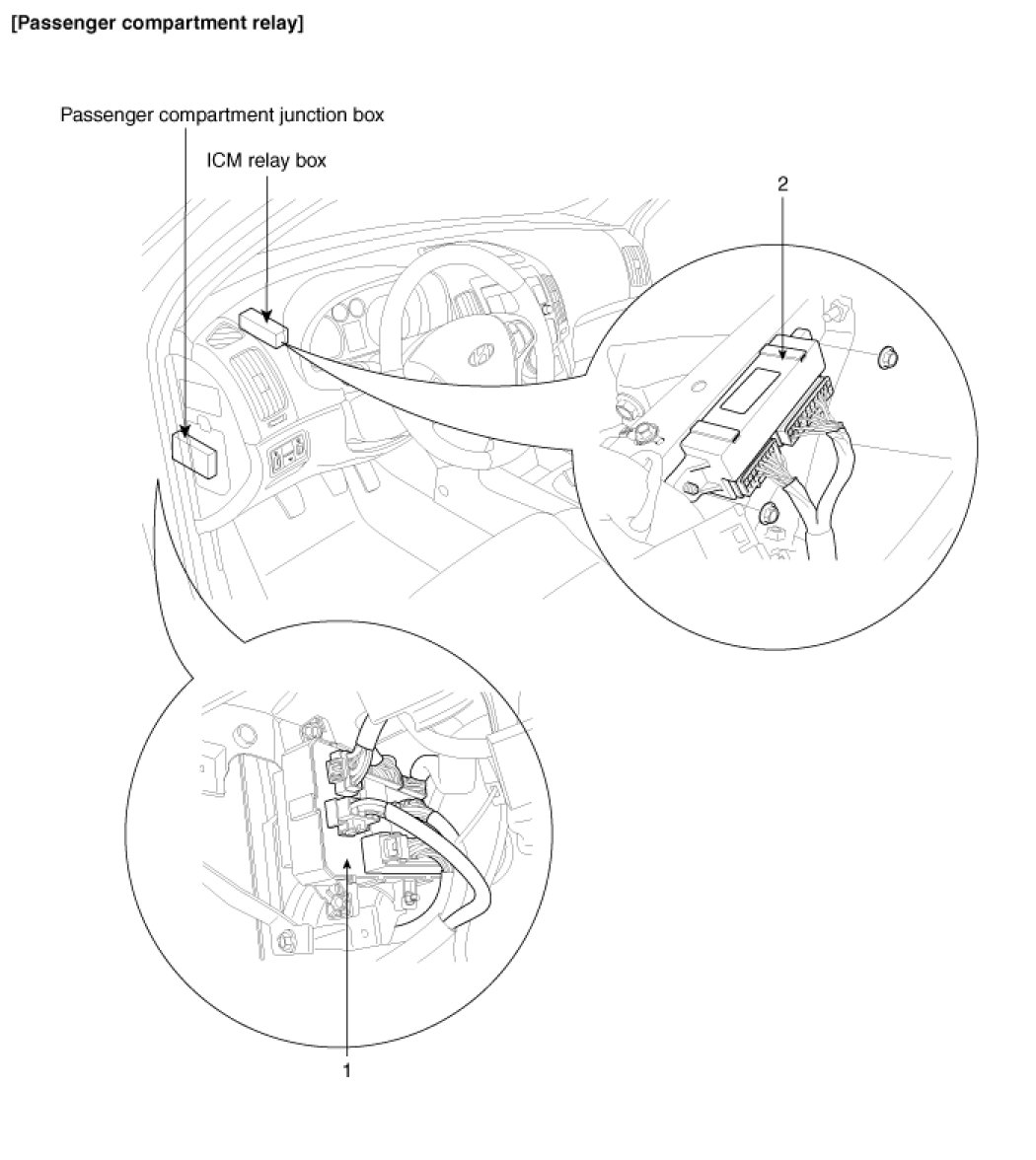 1. Tail lamp relay, Power window relay, Rear heater relay, Trunk lid relay (Built-in-Junction box)