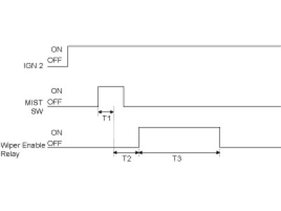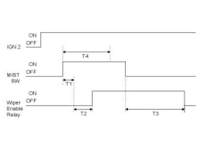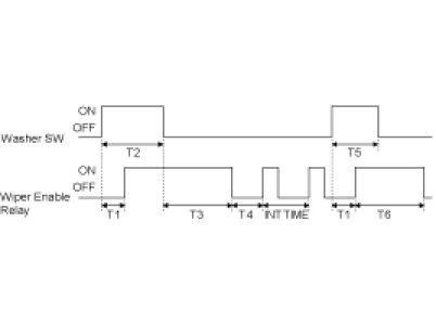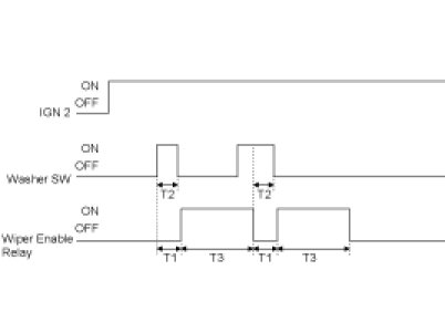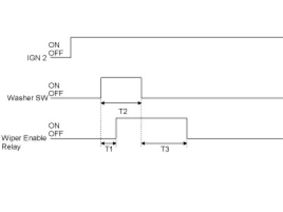 Turn Wiper Enable Relay ON after T1 when turning Washer SW ON at the status of IGN2 ON and if the input of Washer SW is between 0.06 and 0.2sec, turn the output of Wiper Enable Relay OFF after T3.But, ignore the input of Washer SW occurred while Wiper Enable Relay is being operated and accept it from the input of Washer SW after operating Wiper Enable Relay.