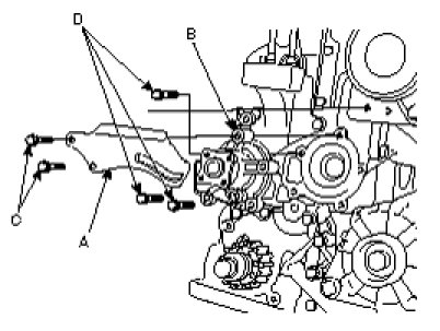 Install the water pump (B) and a new gasket with the 3 bolts(D).