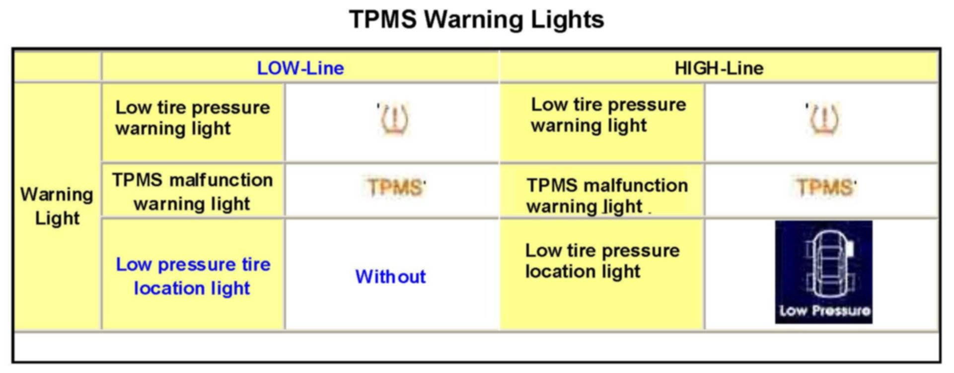 The TPMS system is designed to monitor tire pressure and alert the driver when a tire is significantly underinflated. Hyundai vehicles feature 2 types of systems termed "High-Line" and "Low-Line". High-Line systems are able to display a low pressure condition for each tire position, while Low-Line systems do not indicate which tire is underinflated.