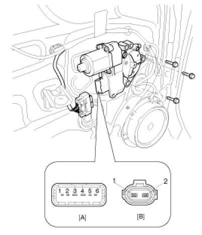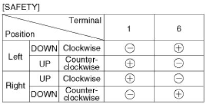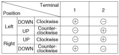 4. Connect the motor terminals directly to battery voltage (12V) and check that the motor operates smoothly. Next, reverse the polarity and check that the motor operates smoothly in the reverse direction. If the operation is abnormal, replace the motor.