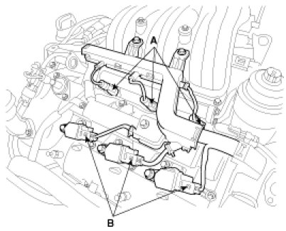 (4) Disconnect the LH injector connector (A) and LH ignition coil connector (B).