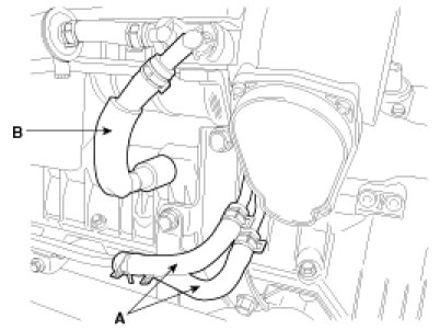 5. Install the throttle body coolant hoses (A) and PCV hose (B).
