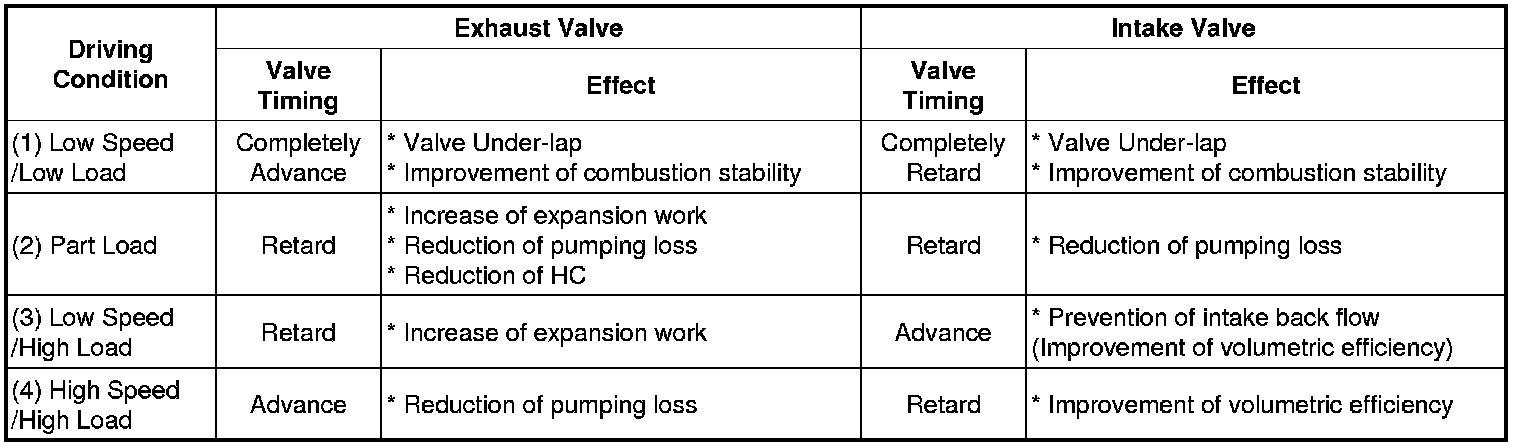 Continuous Variable Valve Timing (CVVT) system advances or retards the valve timing of the intake and exhaust valve in accordance with the ECM control signal which is calculated by the engine speed and load.