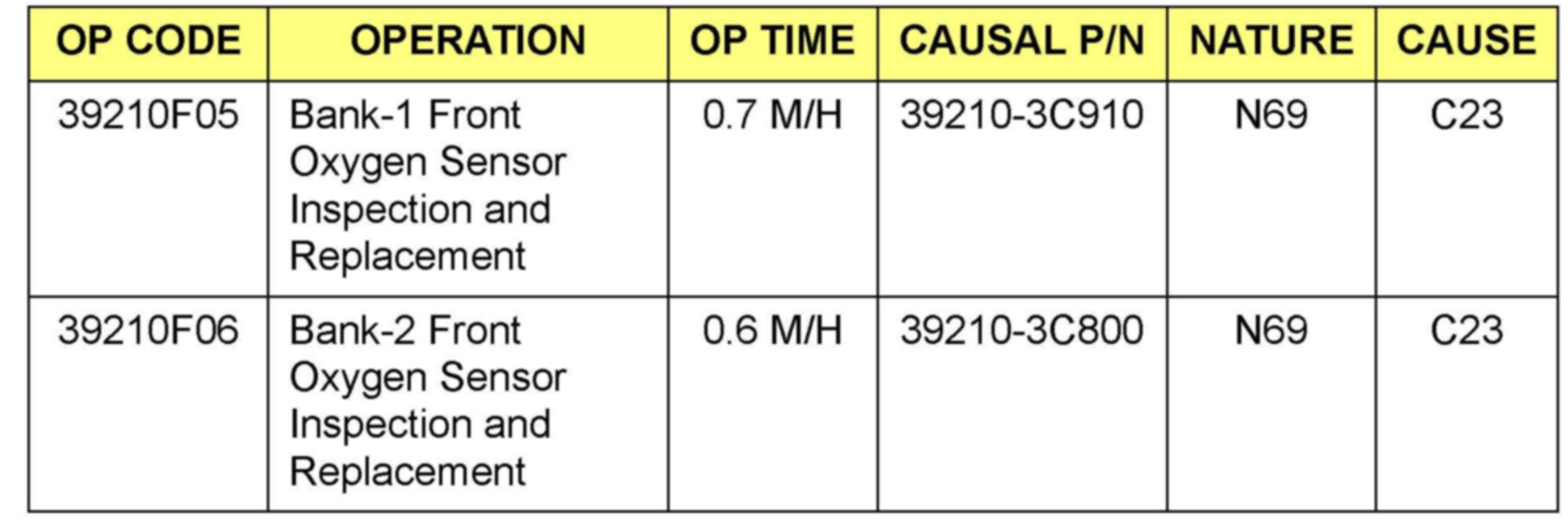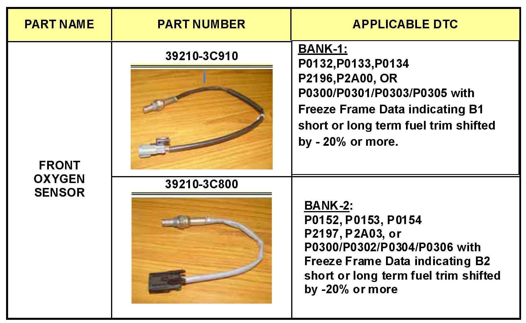 ^ When any of the following DTC(s) related to the front oxygen sensor on bank #1 are stored, replace the front oxygen sensor at bank#1 with the new one listed in the parts information table