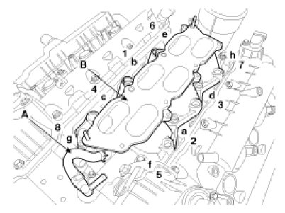 Install the intake the manifold (B) with a new gasket, and connect the water vent hose (A).