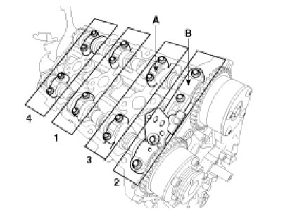 Install the LH/RH camshaft bearing cap (A) and thrust bearing cap (B).