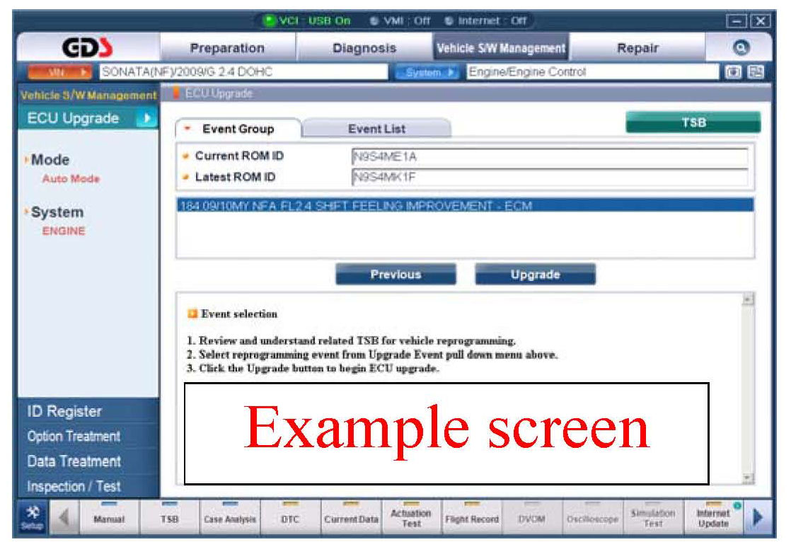This screen is example only. The GDS will show your vehicle, its current ROM ID and latest ROM ID for update based on the event that you select. Select the most recent available (highest) event number in the list, even if it describes a different issue as it will ensure the vehicle receives the latest available updates.