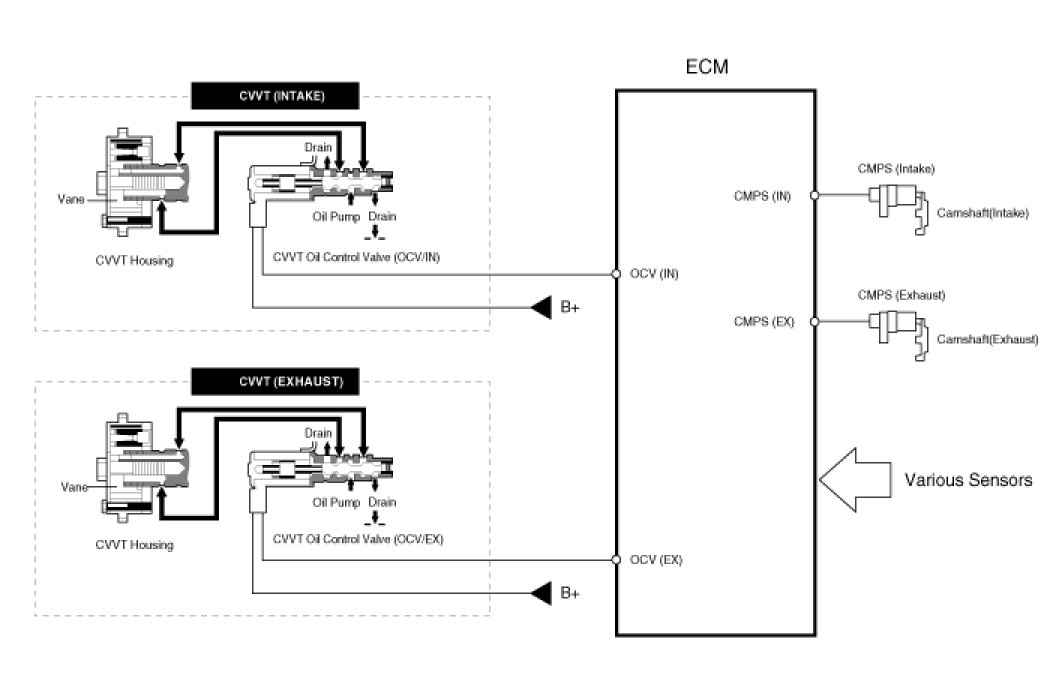 - the CVVT Oil Control Valve (OCV) which supplies the engine oil to the cam phaser or runs out the engine oil from the cam phaser in accordance with the ECM PWM (Pulse With Modulation) control signal,