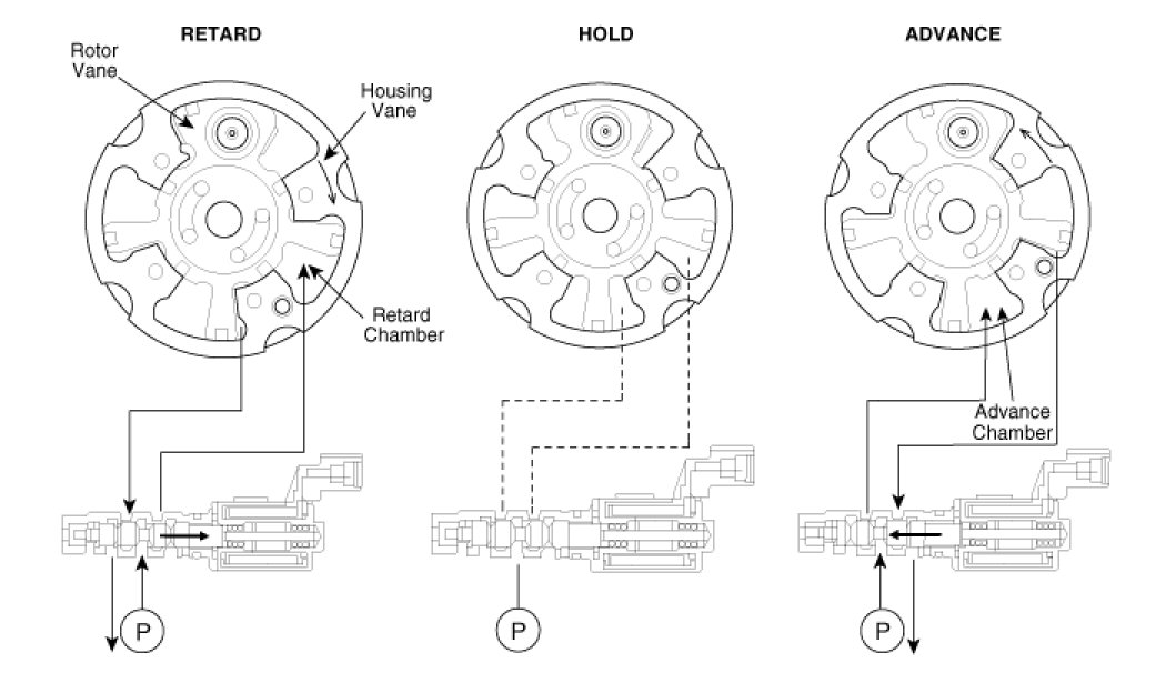The CVVT has the mechanism rotating the rotor vane with hydraulic force generated by the engine oil supplied to the advance or retard chamber in accordance with the CVVT oil control valve control.