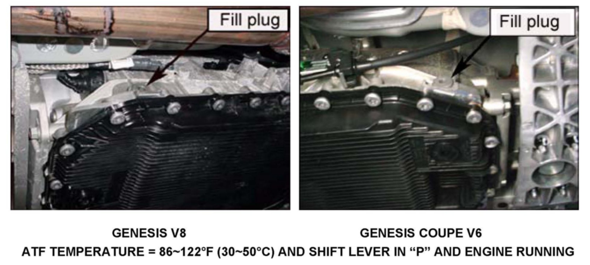 The Genesis V8 and Genesis Coupe V6 ATF level can be checked by the following