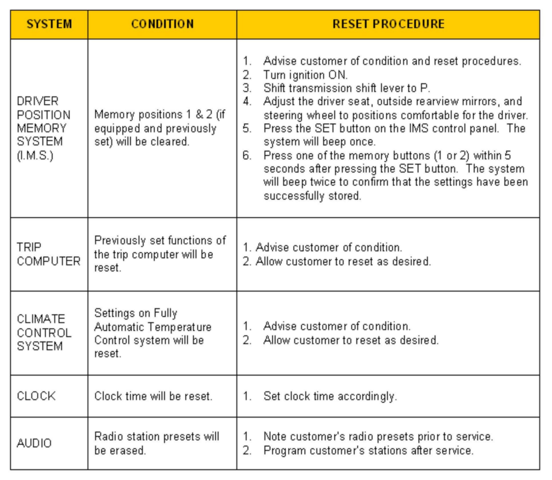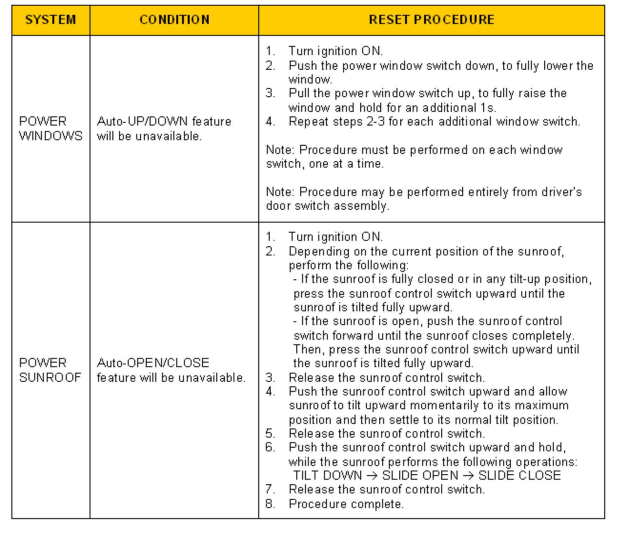 This bulletin provides information on resetting the vehicle's various electronic system components after the vehicle's battery has been disconnected & re-connected, discharged & charged, or the related fuse is replaced or re-installed.