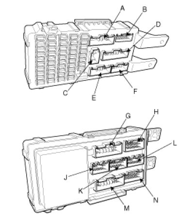 1. There should be continuity between the No.5 terminal in the I/P-J and No.7 terminal in the I/P-K when power and ground are connected to the No.2 terminal in the I/P-C and No.1 terminal in the I/P-K.