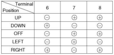 3. Apply battery voltage to each terminal as shown in the table and verify that the mirror operates properly.