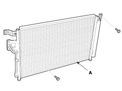 4. Remove 2 bolts, and then remove the condenser (A) by lifting it up. Be careful not to damage the radiator and condenser fins when removing the condenser.