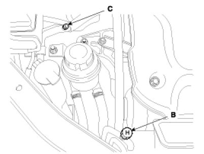 2. Connect an R-134a refrigerant Recovery/Recycling/Charging System (A) to the high-pressure service port (B) and the low-pressure service port (C) as shown, following the equipment manufacturer's instructions.