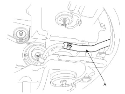 1. Drain the power steering fluid by disconnecting return hose (A).