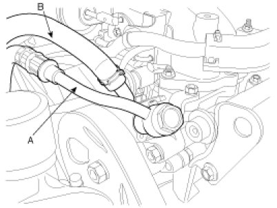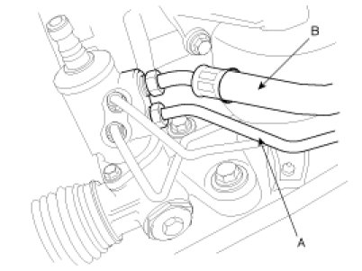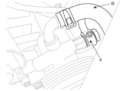 2. Disconnect the pressure tube (A) and suction hose (B) from the power steering oil pump.