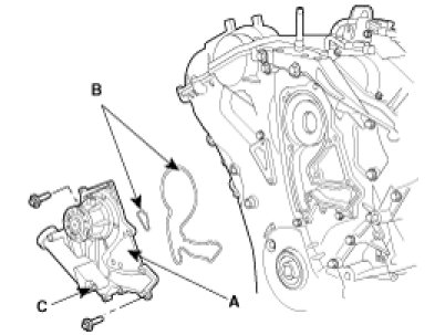 Install the water pump(A) and a new gasket(B) with 12 bolts. Apply sealant on C.