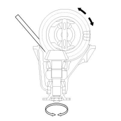 (2) Insert a brass rod between the differential carrier and the differential case, and then rotate the companion flange by hand (once in the normal direction, and then once in the reverse direction) while applying a load to the drive gear so that some torque (approximately 25 - 30Nm) is applied to the drive pinion.