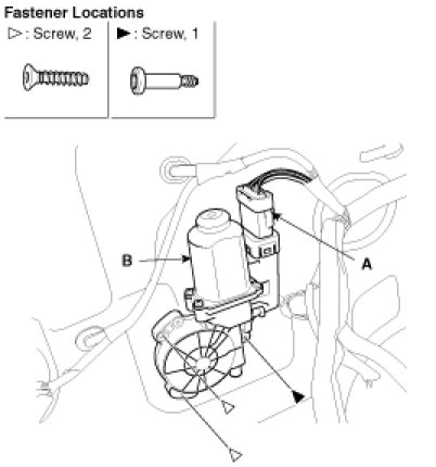 2. After disconnecting the connector (A), remove the power window motor (B).