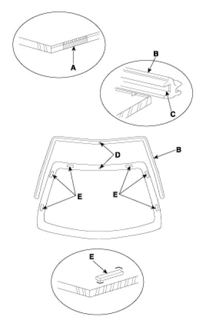 4. When attaching the molding, make it in line (D) with the windshield glass and attach the windshield glass pad (E)to the designated place.