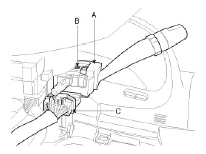 3. Remove the wiper switch (A) by pushing the lock pin (B) after disconnecting the connector (C).