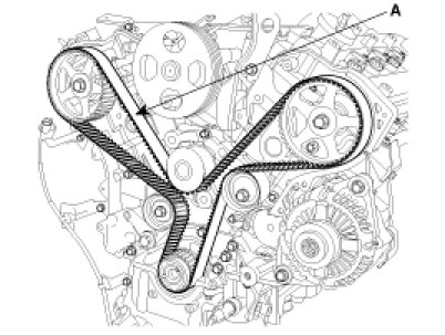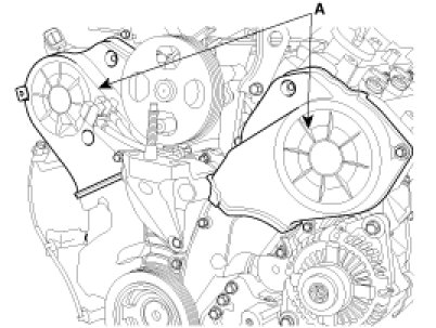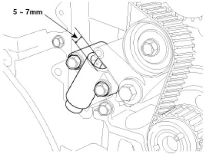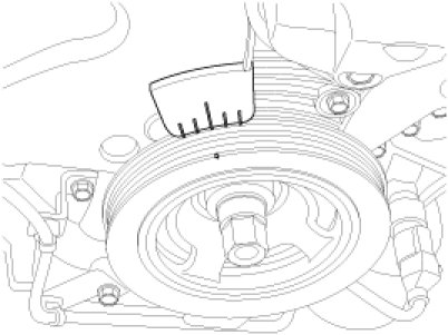 6. Align the groove of the pulley with the timing mark of the timing belt cover by turning the crankshaft pulley clockwise. Check if the timing mark of the camshaft sprocket is aligned with that of the cylinder head cover at the moment.