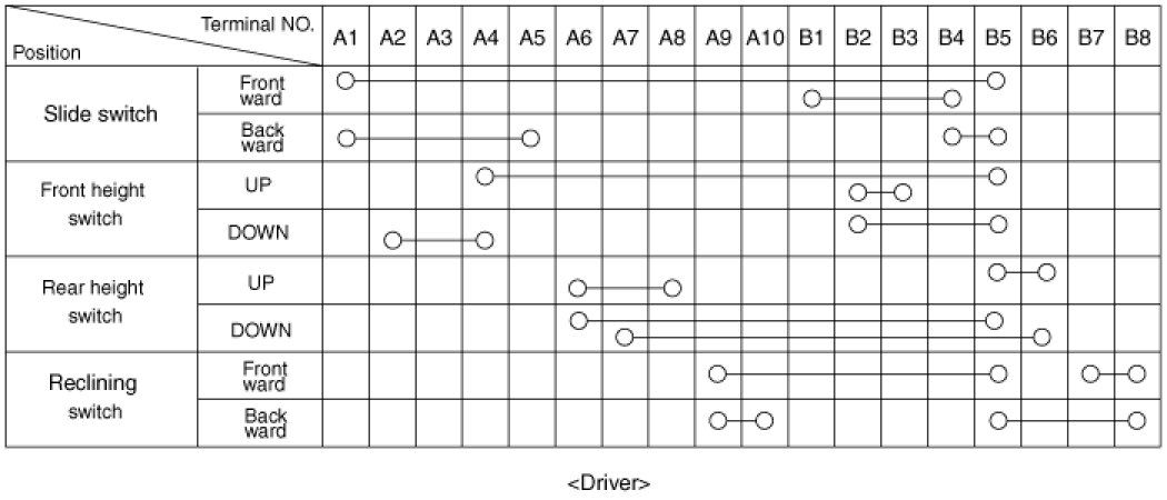 power seat switch in each position, make sure that continuity exists between the terminals below. If continuity is not as specified, replace the power seat switch.