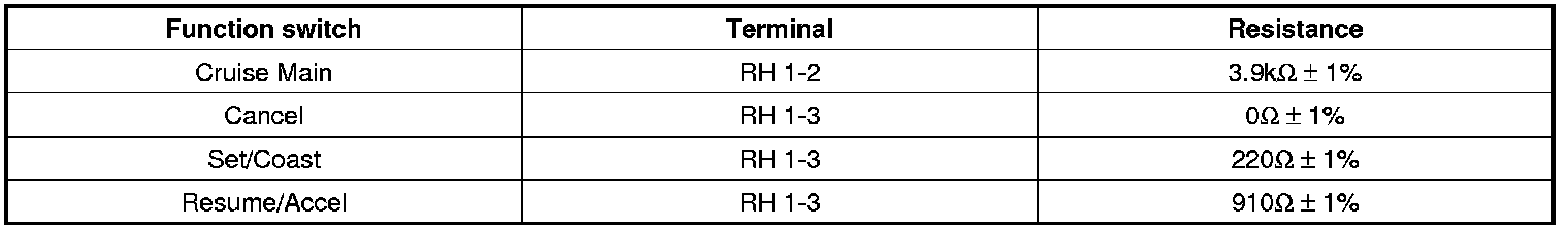 2. Measure resistance between terminals on the control switch when each function switch is ON (switch is depressed).