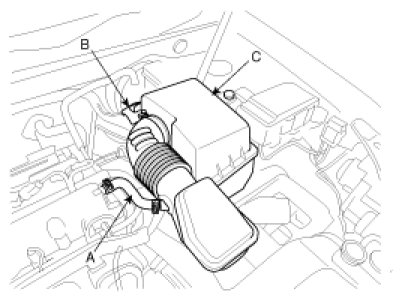 2. Disconnect the breather hose (A), ECM connector (B) and remove the air cleaner assembly (C).