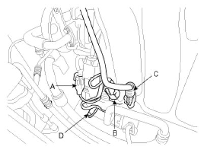 6. Connect the brake booster vacuum hose (D), PCSV hose (C), fuel hose(B) and CMP sensor connector(A).
