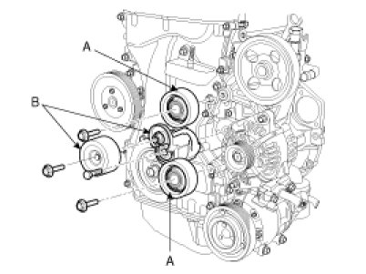 9. Remove the idler (A) and drive belt tensioner (B).