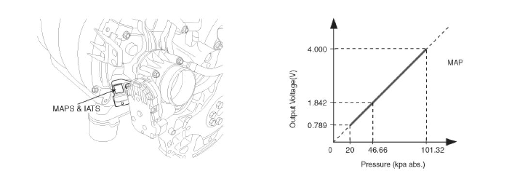 Manifold Absolute Pressure Sensor (MAPS) is speed-density type sensor and is installed on the surge tank. This MAPS senses absolute pressure in surge tank and transfers this analog signal proportional to the pressure to the PCM. The PCM calculates the intake air quantity and engine speed based on this signal. This MAPS consists of piezo-electric element and hybrid IC that amplifies the element output signal. The element is silicon diaphragm type and adapts pressure sensitive variable resistor effect of semi-conductor. 100% vacuum and the manifold pressure applies to both sides of it respectively. The sensor outputs the silicon variation proportional to pressure change by voltage.