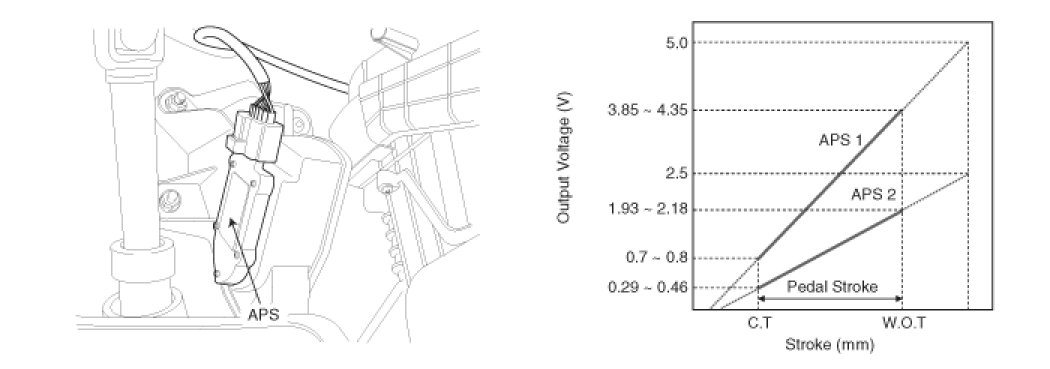 Accelerator Position Sensor (APS) is installed on the accelerator pedal module and detects the rotation angle of the accelerator pedal. The APS is one of the most important sensors in engine control system. It consists of two sensors which control individual sensor power and ground line. The second sensor monitors the first sensor and its output voltage is half of the first one. If the ratio of the sensor 1 and 2 (approximately 1/2) is out of the range, the diagnostic system judges it as abnormal.
