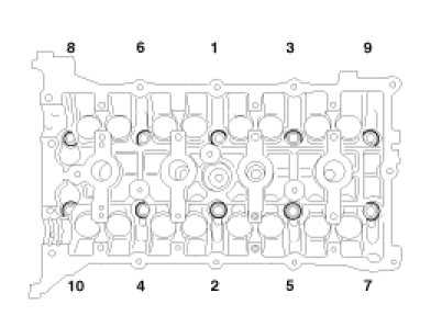 B. Using hexagon wrench, install and tighten the 10 cylinder head bolts and plate washers, in several passes, in the sequence shown.