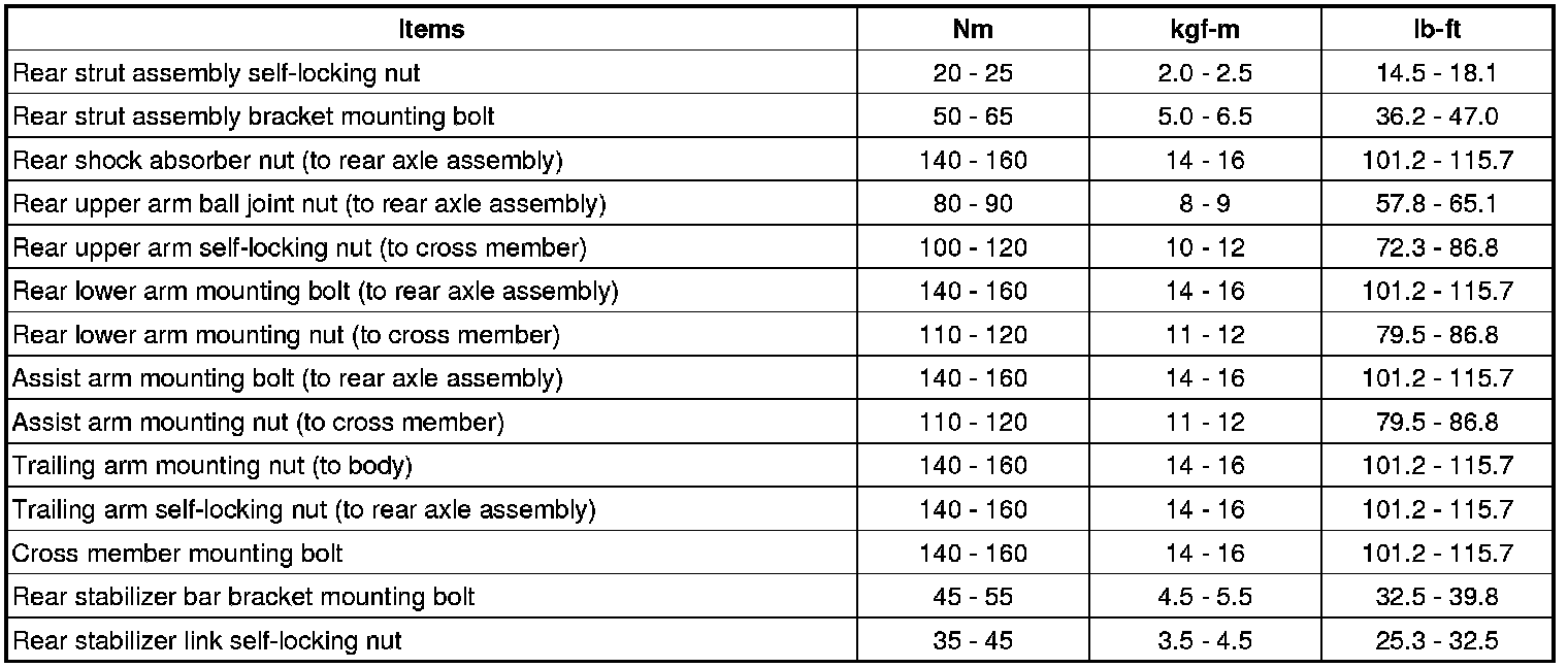 Tightening TorquesRear SuspensionCAUTION:Replace the self-locking nuts with new ones after removal.