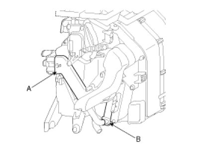6. Disconnect the inlet (A) and outlet (B) heater hoses from the heater unit.