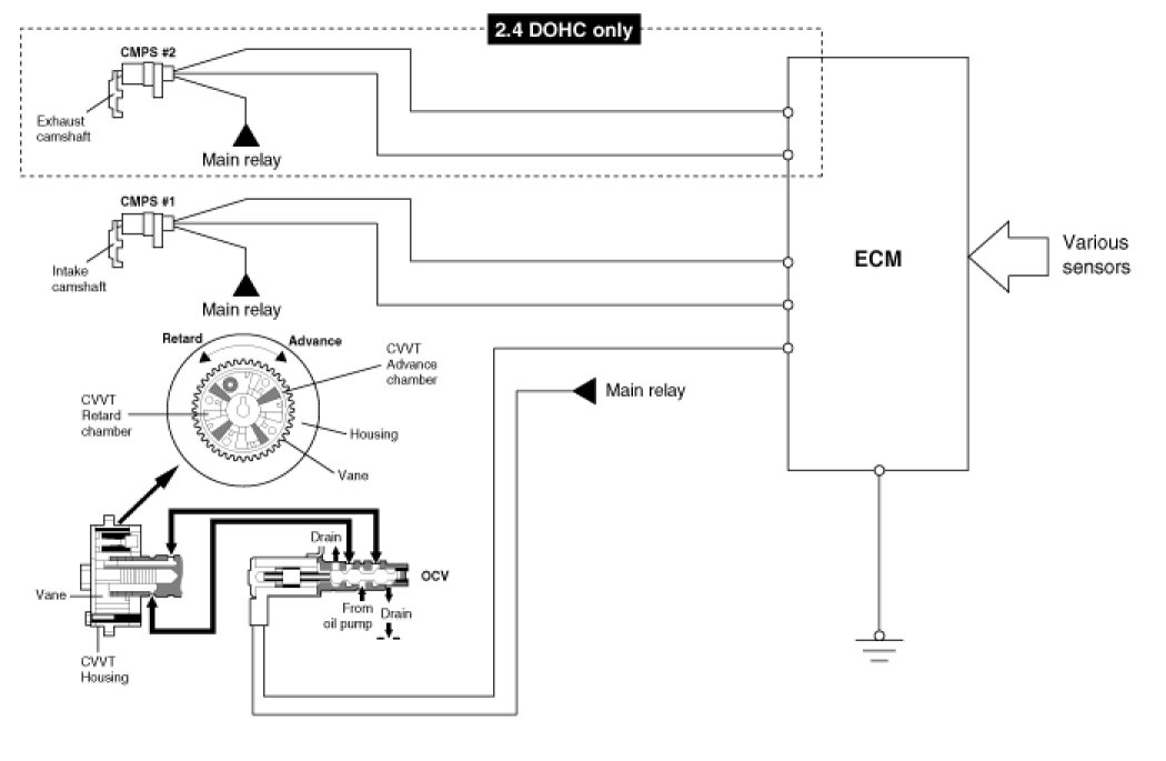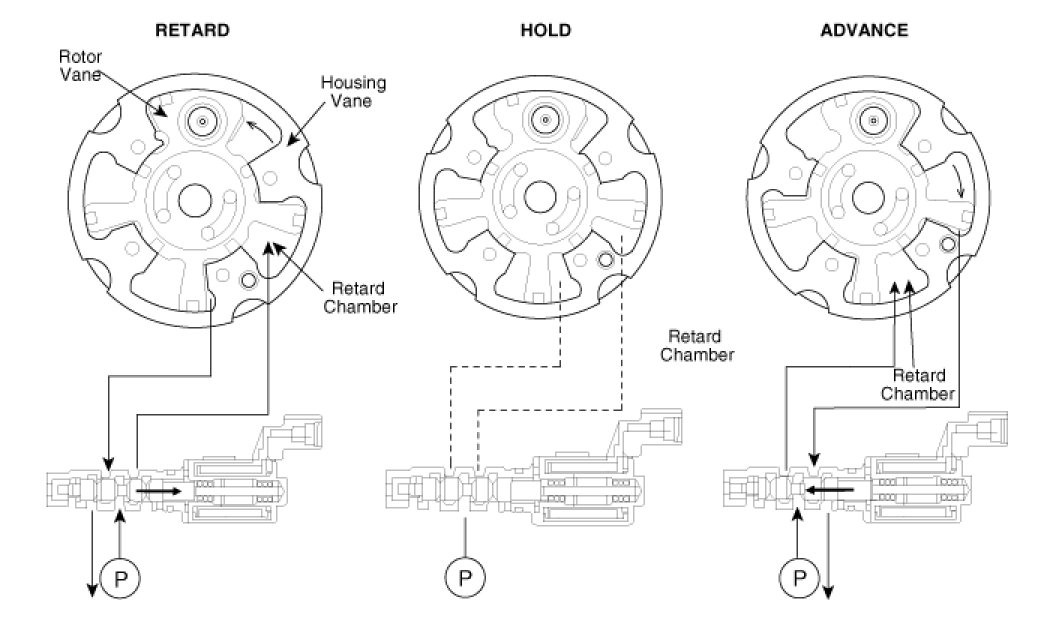 The CVVT changes the phase of the intake camshaft via oil pressure.It changes the intake valve timing continuously.