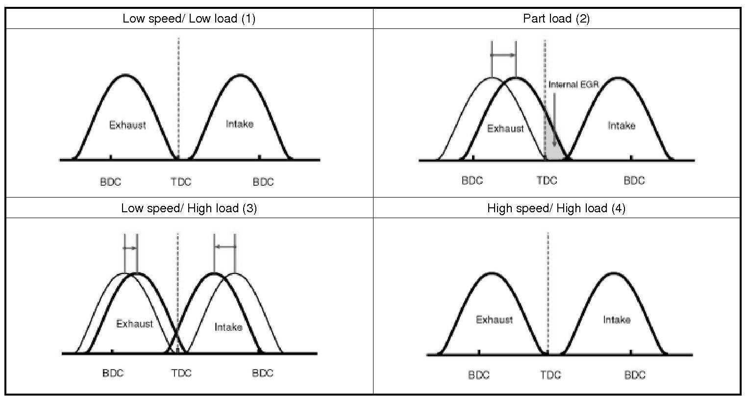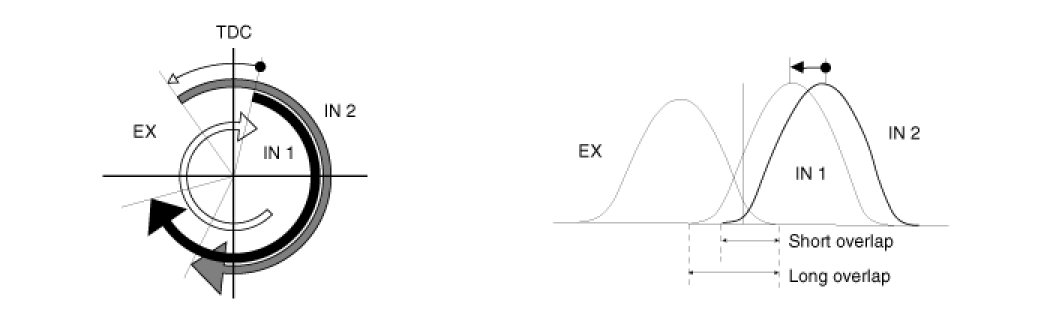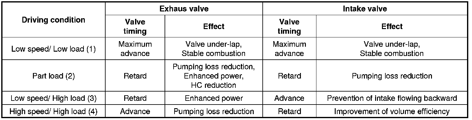 This CVVT system improves fuel efficiency and reduces NOx emissions at all levels of engine speed, vehicle speed, and engine load through the effects of the EGR by valve overlap optimization.